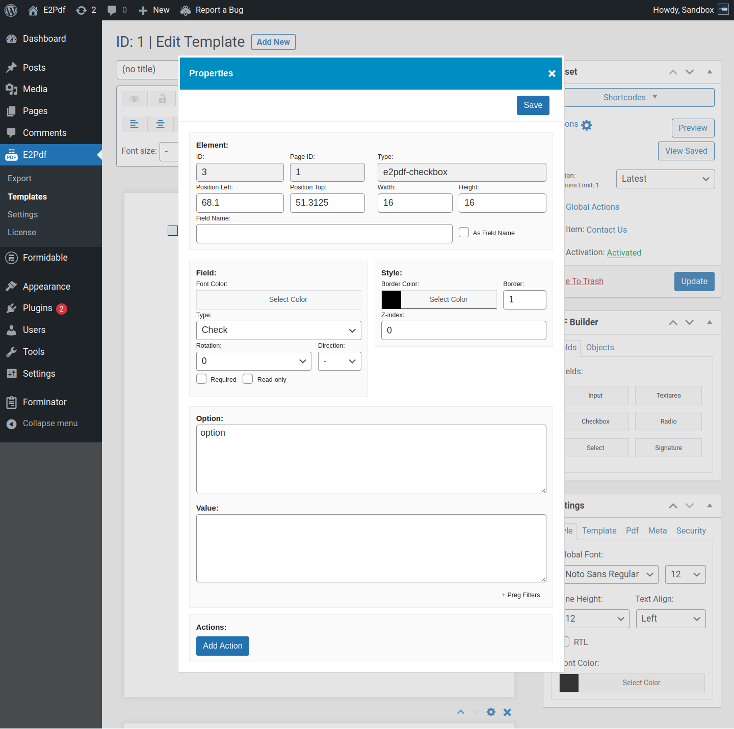 • Rotation - is the text rotation. It will be rotated just the checkmark and not the element, so the element width and height must be set as you need to see it inside PDF.
