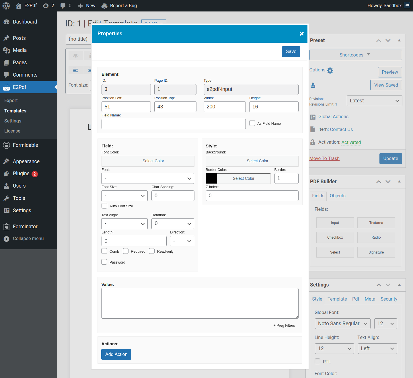 • Font Size - is the font size of the text. If not set, global E2Pdf Template font size will be used.