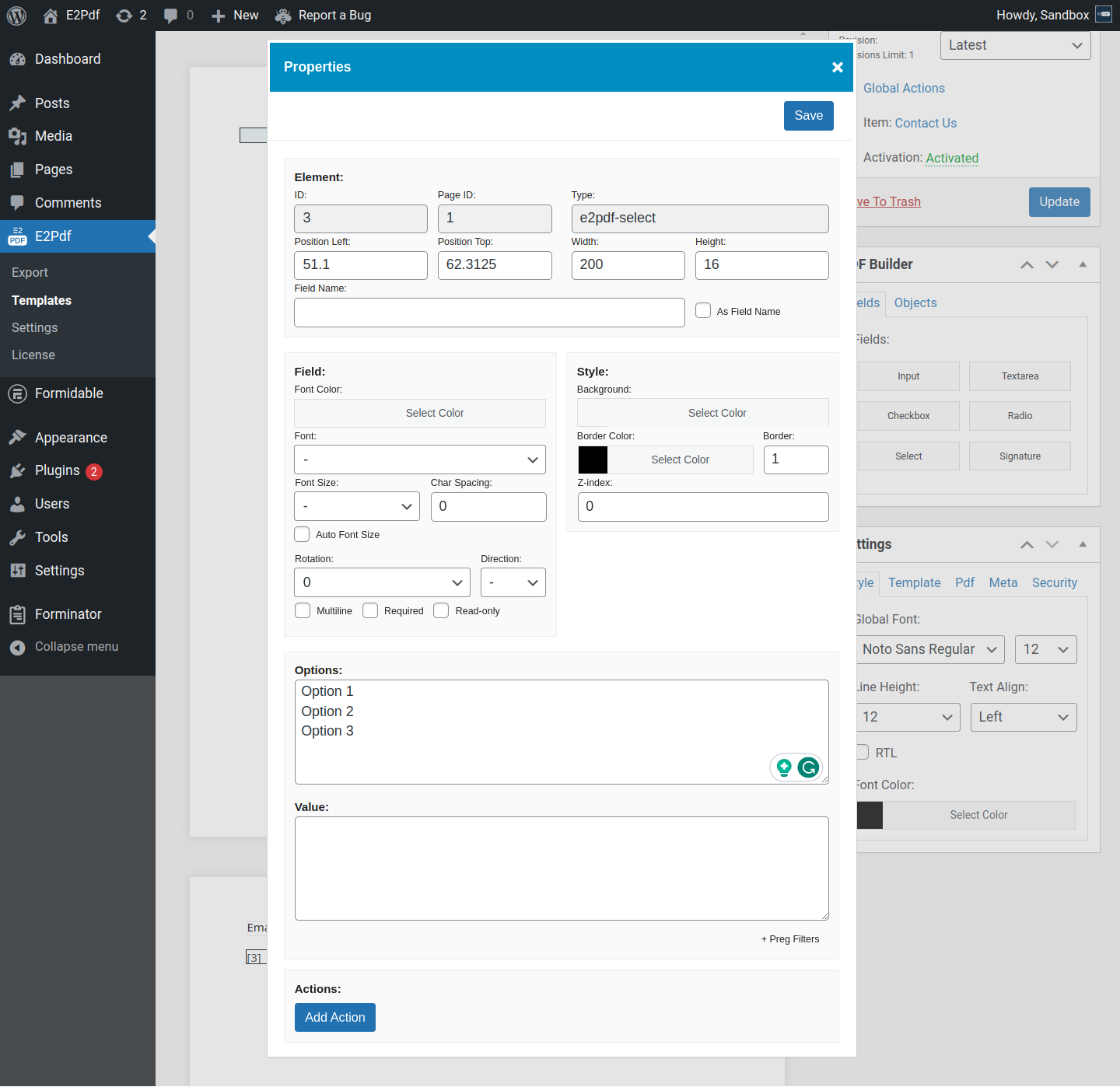 • Font Size - is the font size of the text. If not set, global E2Pdf Template font size will be used.