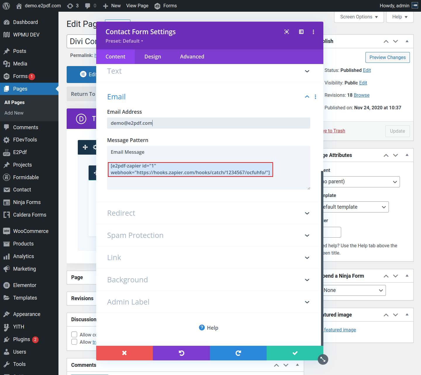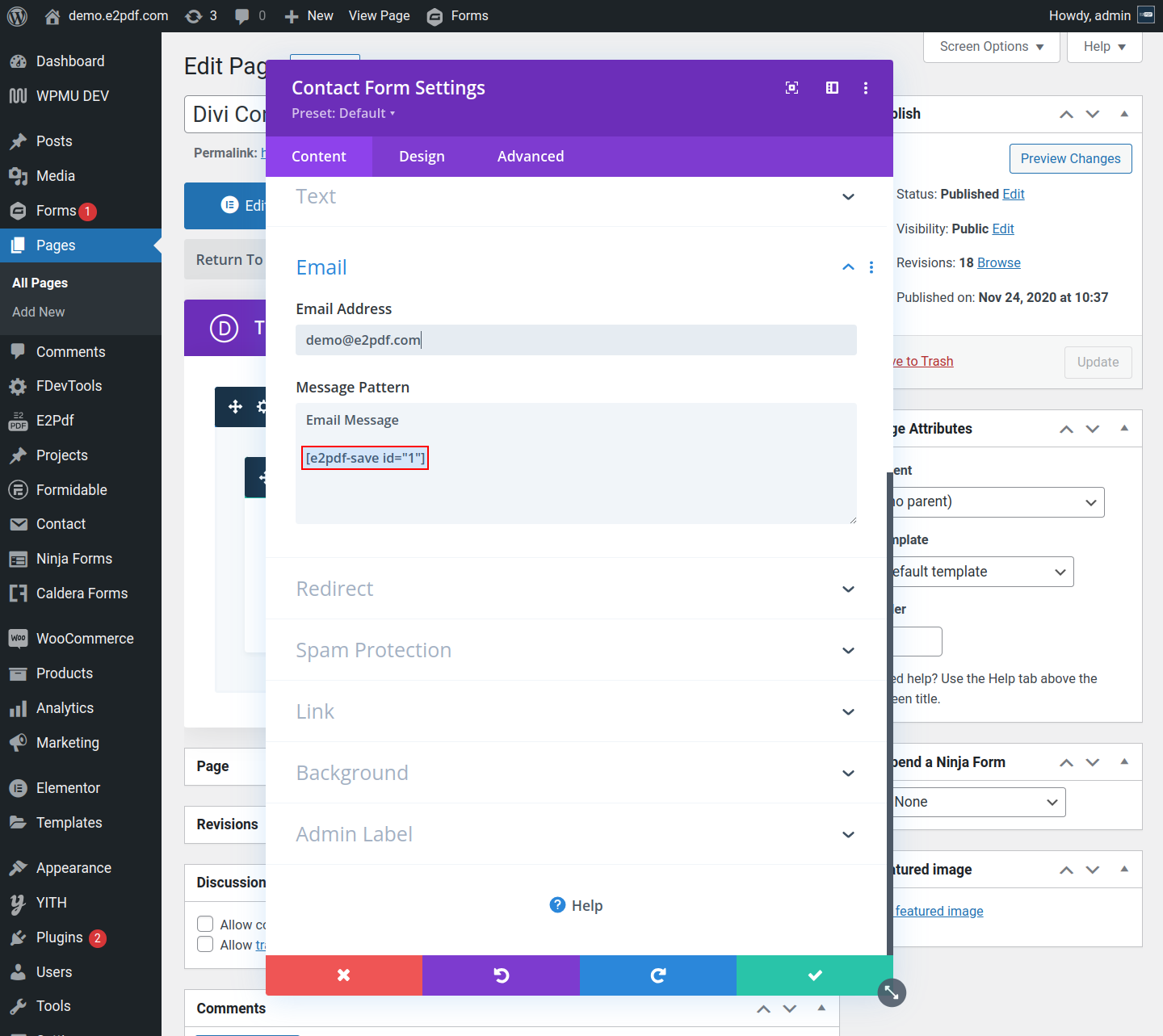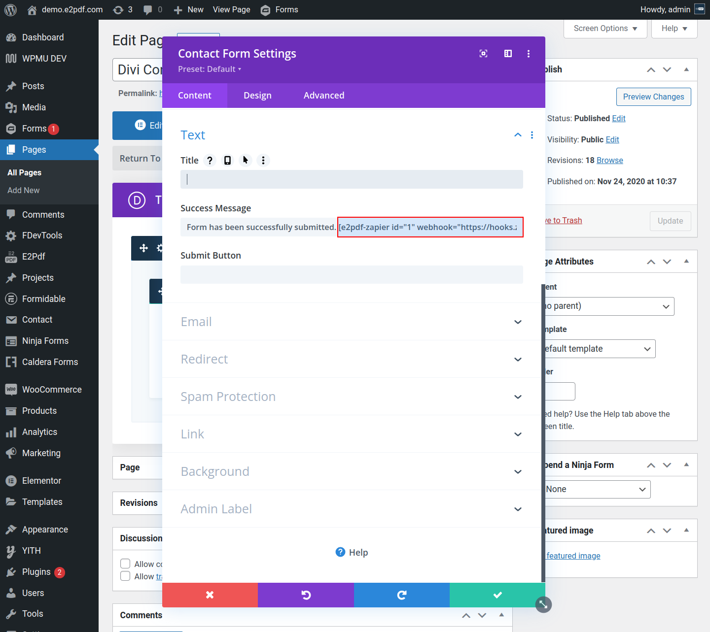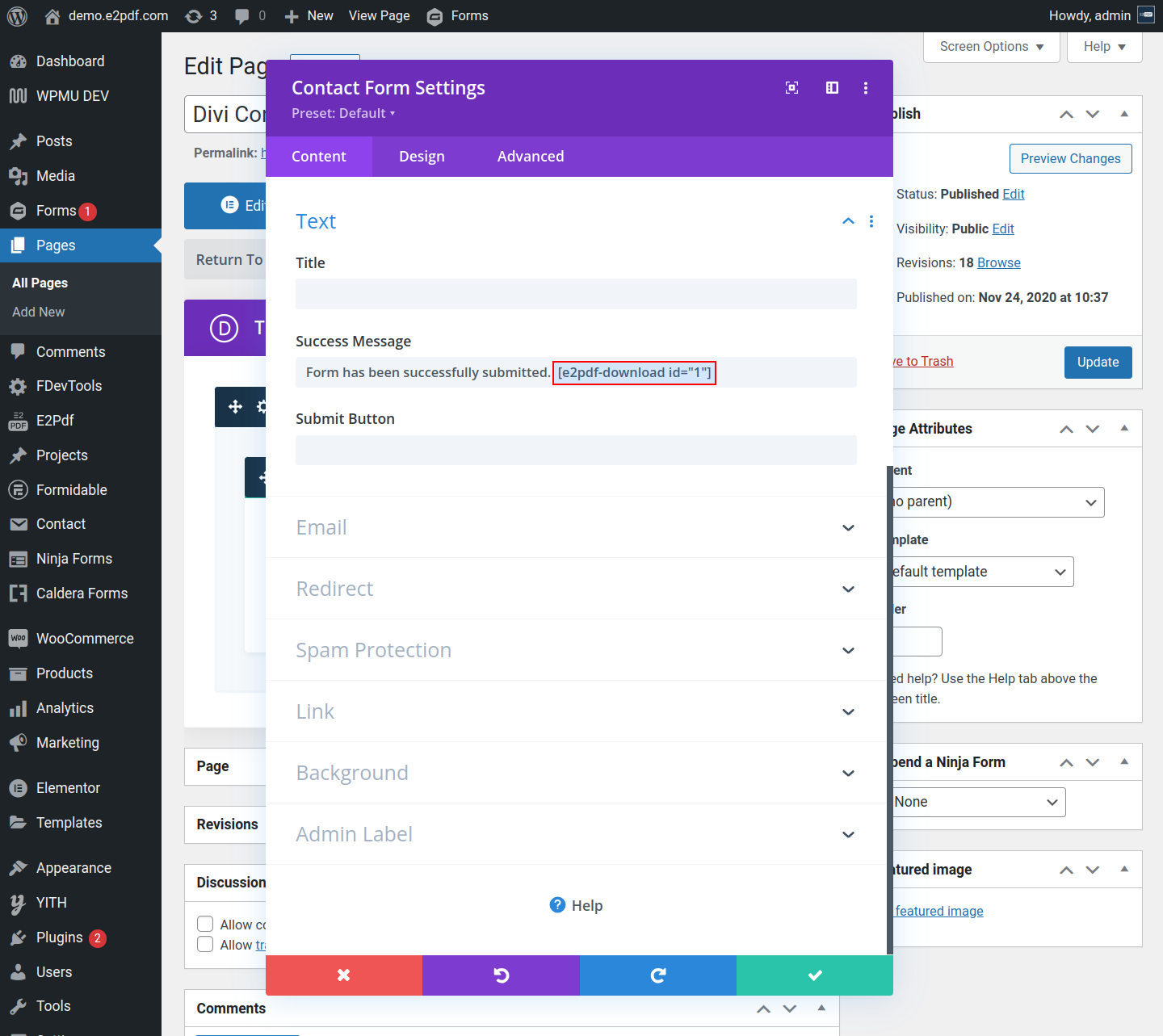 E2Pdf further extends the Divi Contact Form Module functionality by saving entries to allow PDFs to be created and attached to the email when the submit button is clicked or with a E2Pdf shortcode link at any time. Saved entries may be deleted one at a time, or all at one time.