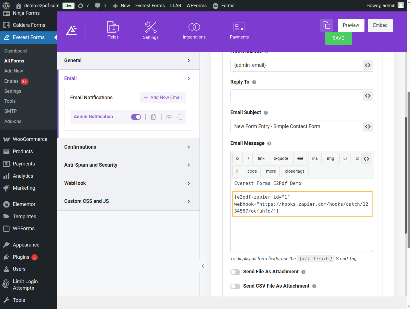 Create and fill PDF documents with data from the Everest Forms plugin. E2Pdf shortcodes can be used inside "Confirmation Message" / "Email Notification".
