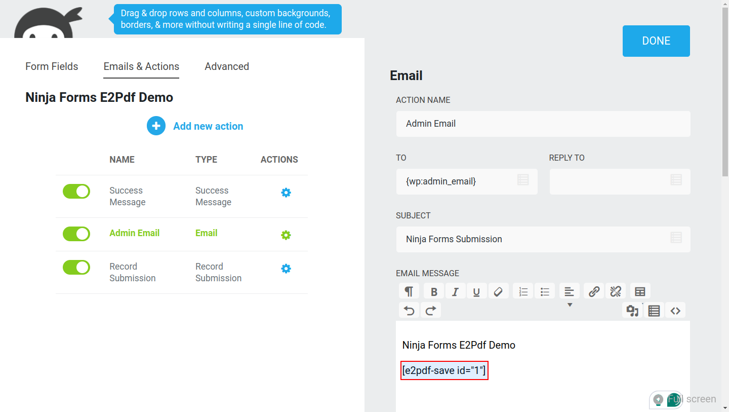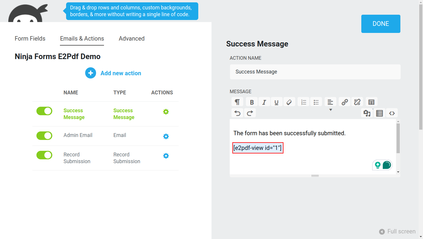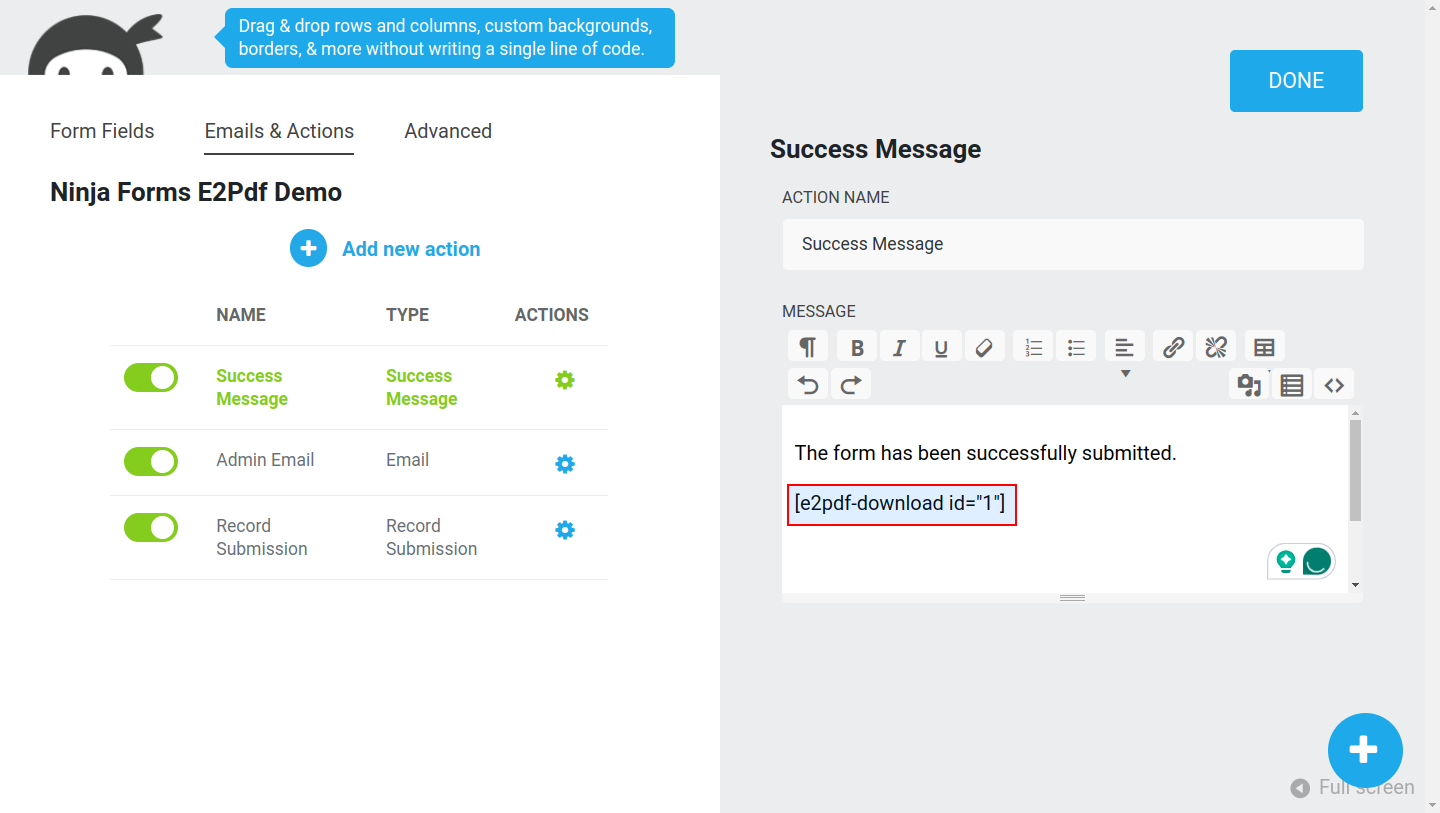 E2Pdf Templates support native Tags syntax, so it's recommended to review Ninja Forms documentation: https://ninjaforms.com/docs/merge-tags/. E2Pdf shortcodes can be used inside "Success Message" / "Email Notification".