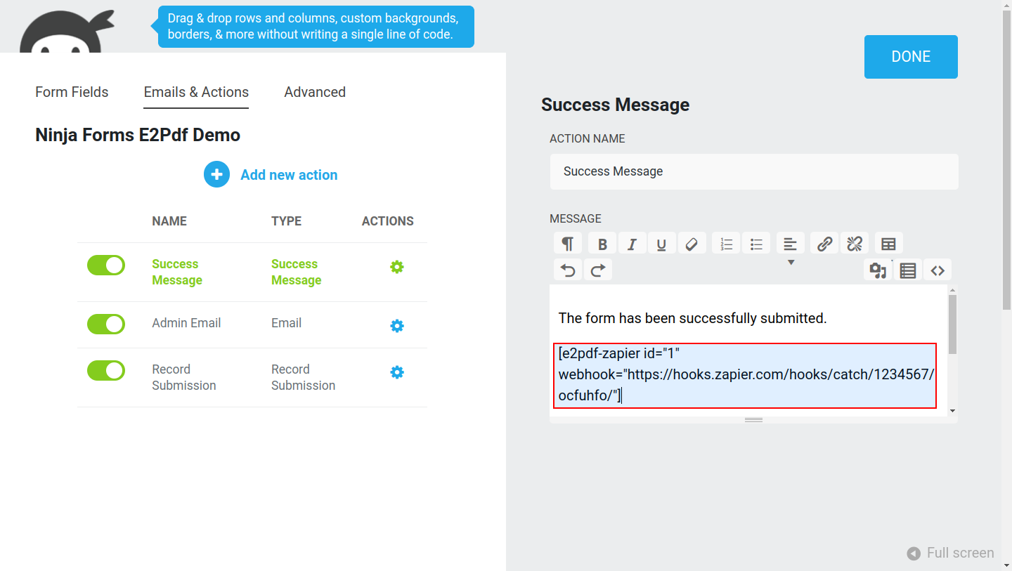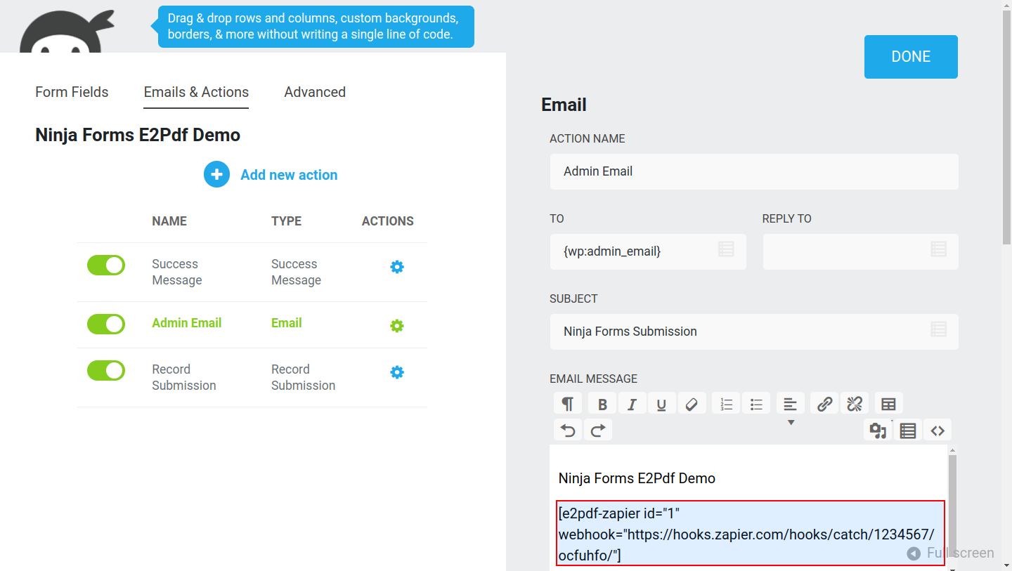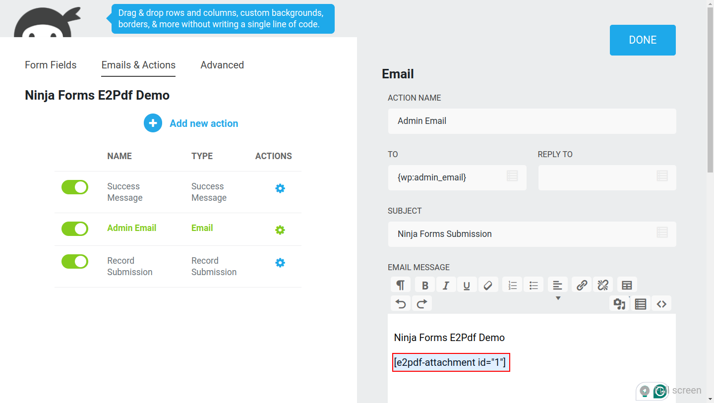E2Pdf Templates support native Tags syntax, so it's recommended to review Ninja Forms documentation: https://ninjaforms.com/docs/merge-tags/. E2Pdf shortcodes can be used inside "Success Message" / "Email Notification".