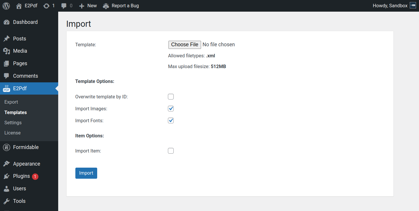 After importing the E2Pdf Template it can be that E2Pdf Template requires "re-connection" to the "Item". It can be done by going to the imported E2Pdf Template and setting "Item" under "Options".