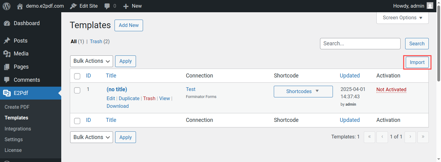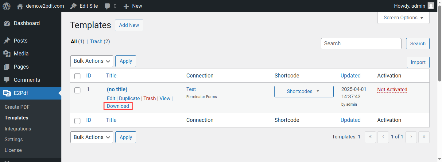 Also, be sure that the "status" of the E2Pdf Template is "Activated". If not, activate it to make it active.