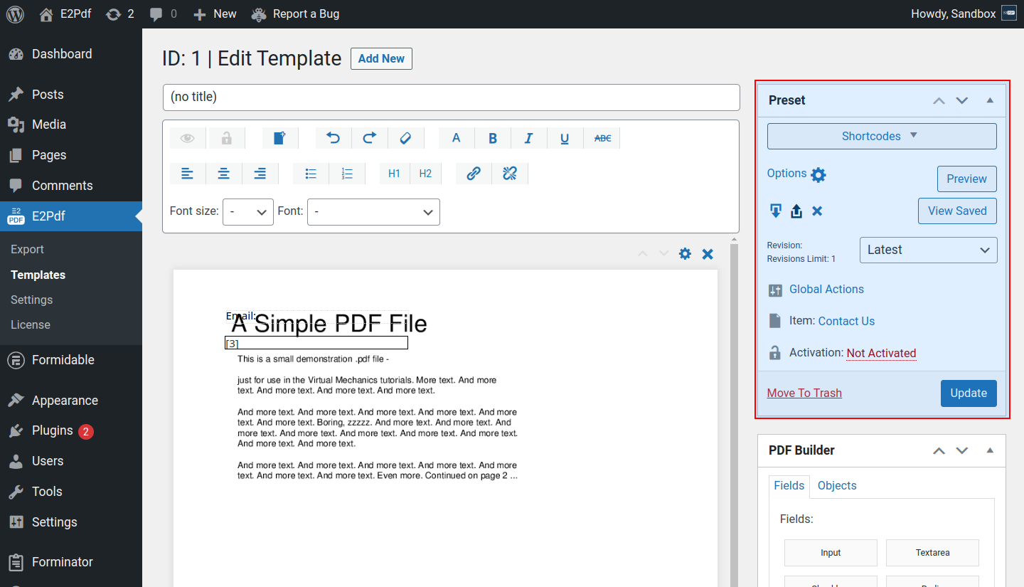 • Revision - is used to restore the old version of the E2Pdf Template. The revision will be created on the Save / Update E2Pdf Template action. The number of saved revisions can be set under E2Pdf -> Settings -> Revisions Limit. The default is 3.