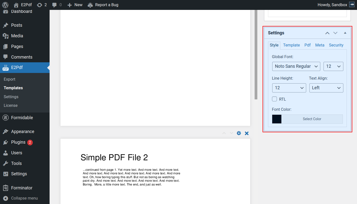 • Global Font - default text font that will be used on all E2Pdf Template elements. New fonts can be uploaded via "E2Pdf" -> "Settings" -> "Fonts".