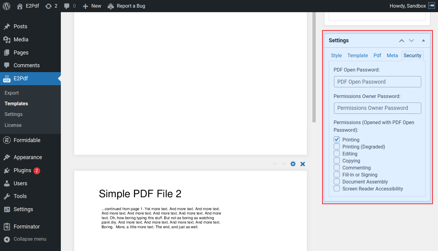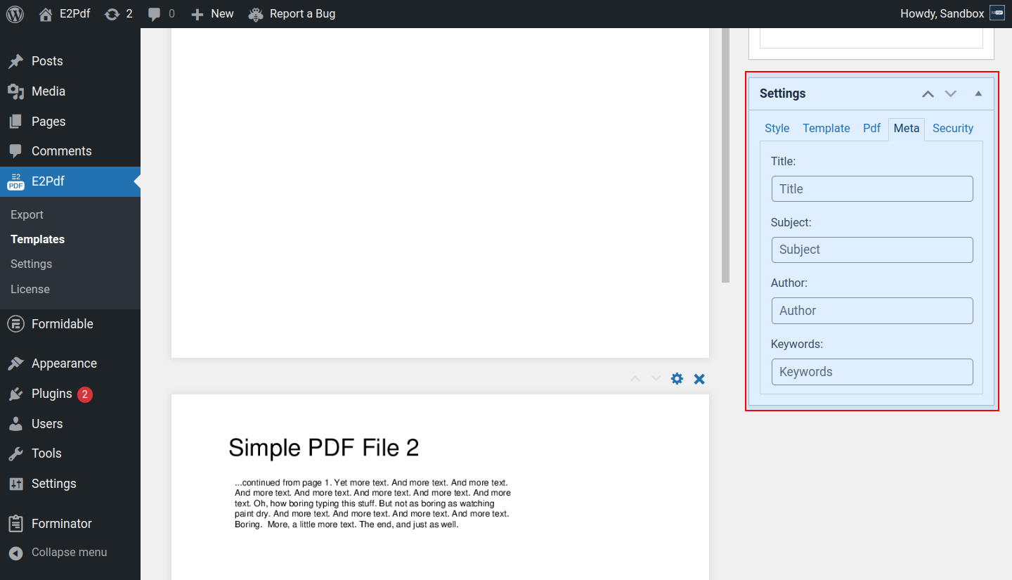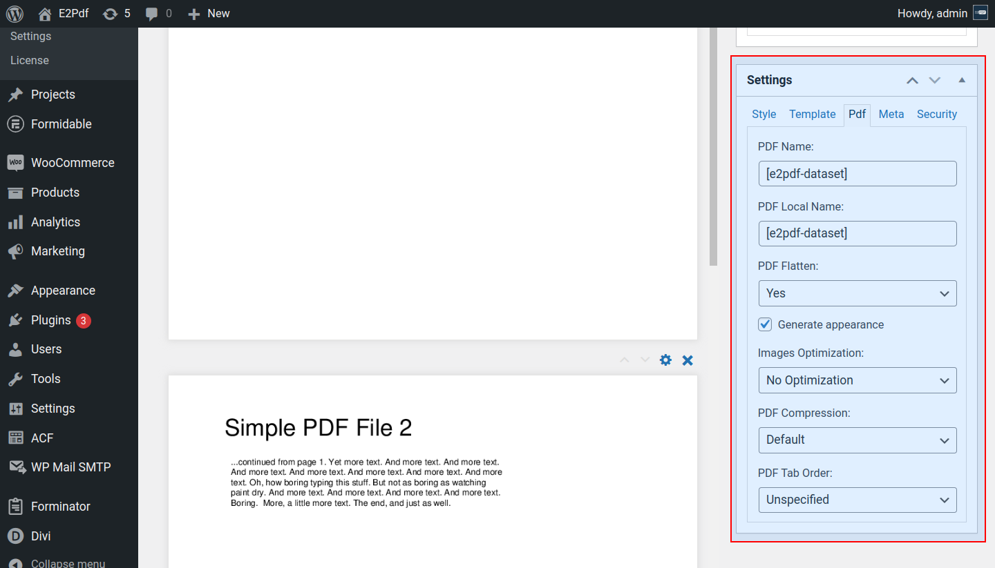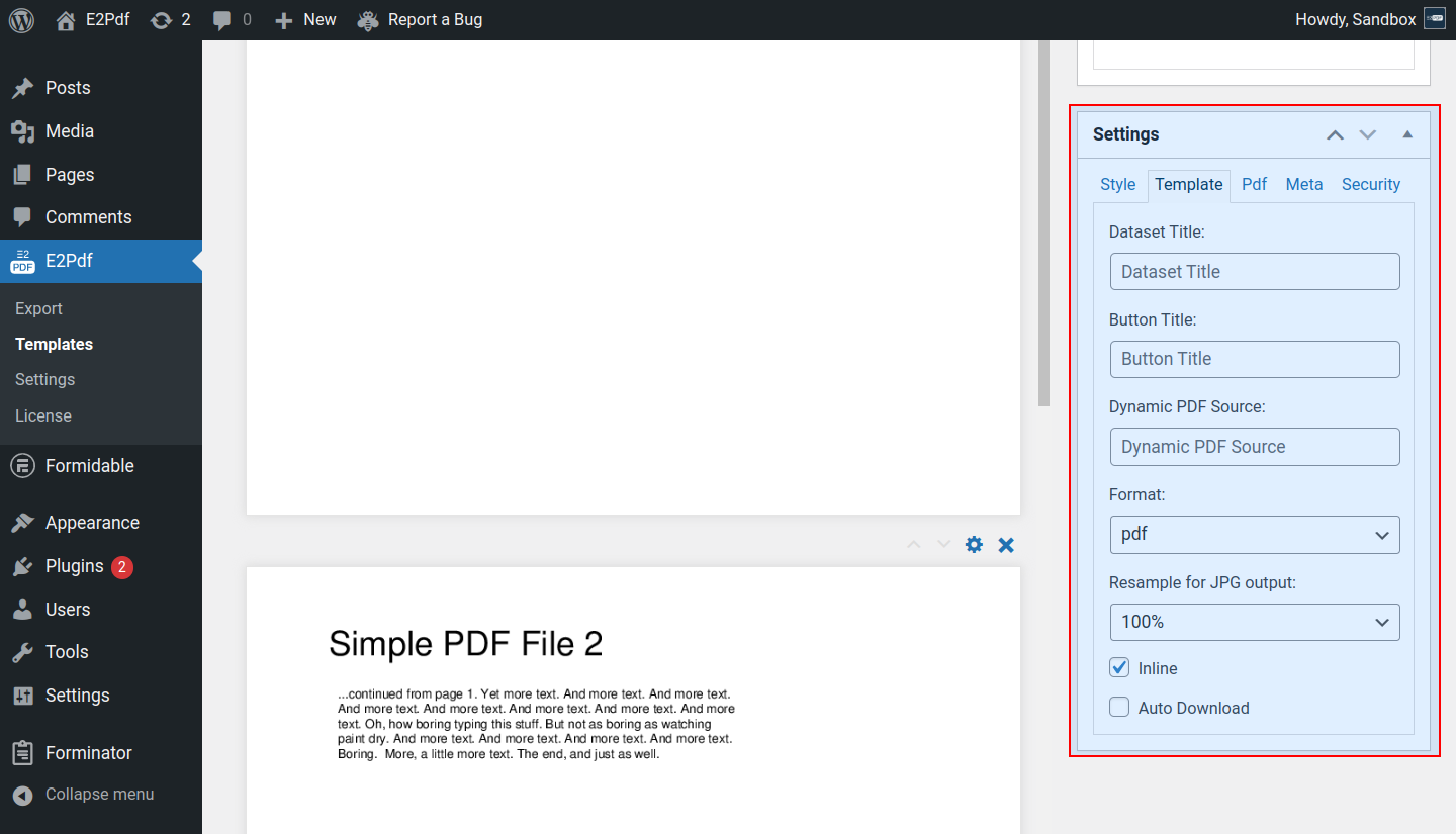 • Dataset Title - is the "Title" used at "E2Pdf" -> "Export". Can be used shortcodes available in the context of the E2Pdf Template.