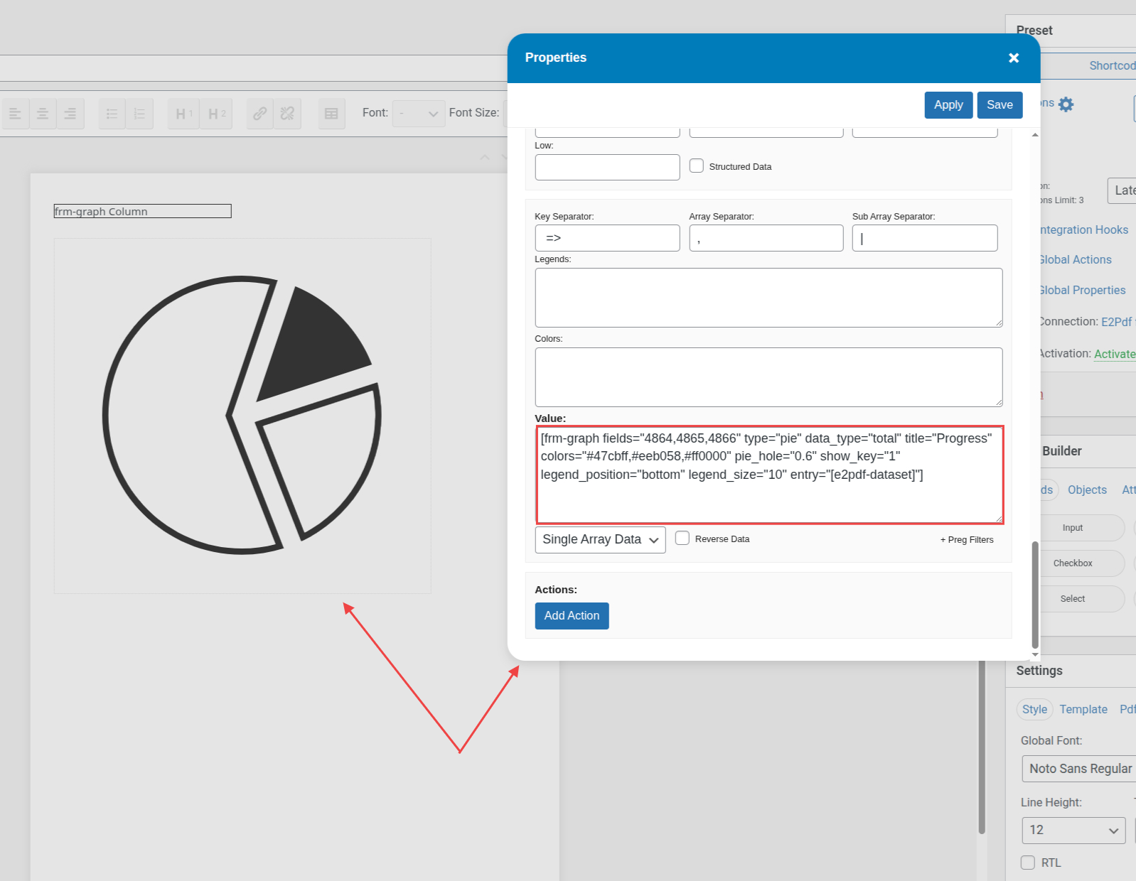 After updating, you should be able to use the [frm-graph] shortcode directly in the Graph Value field. If the graph should be generated for a specific entry, the entry="[e2pdf-dataset]" attribute must be added. Please refer to the attached screenshot for reference.